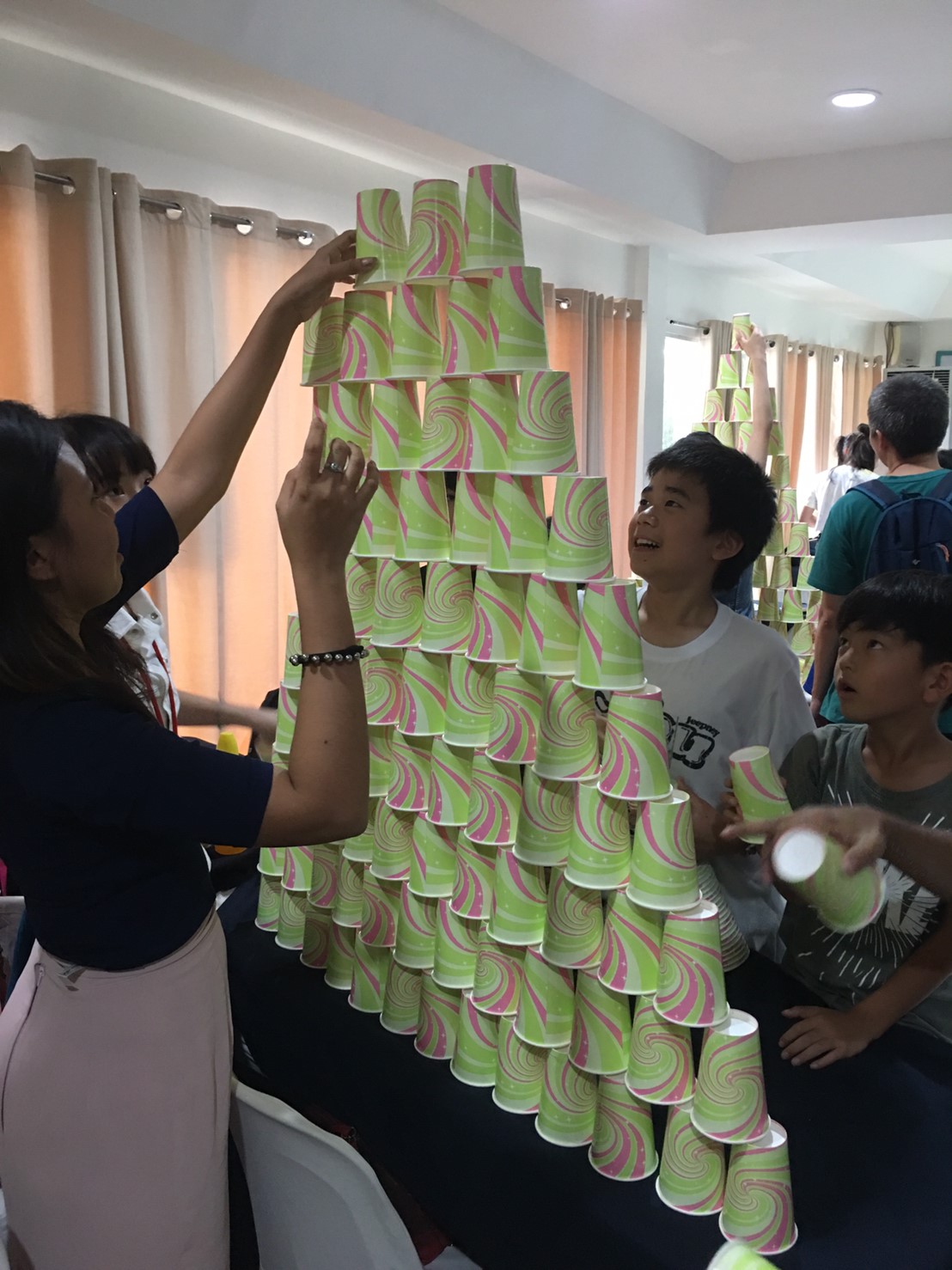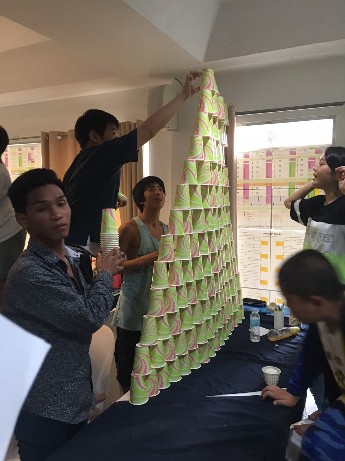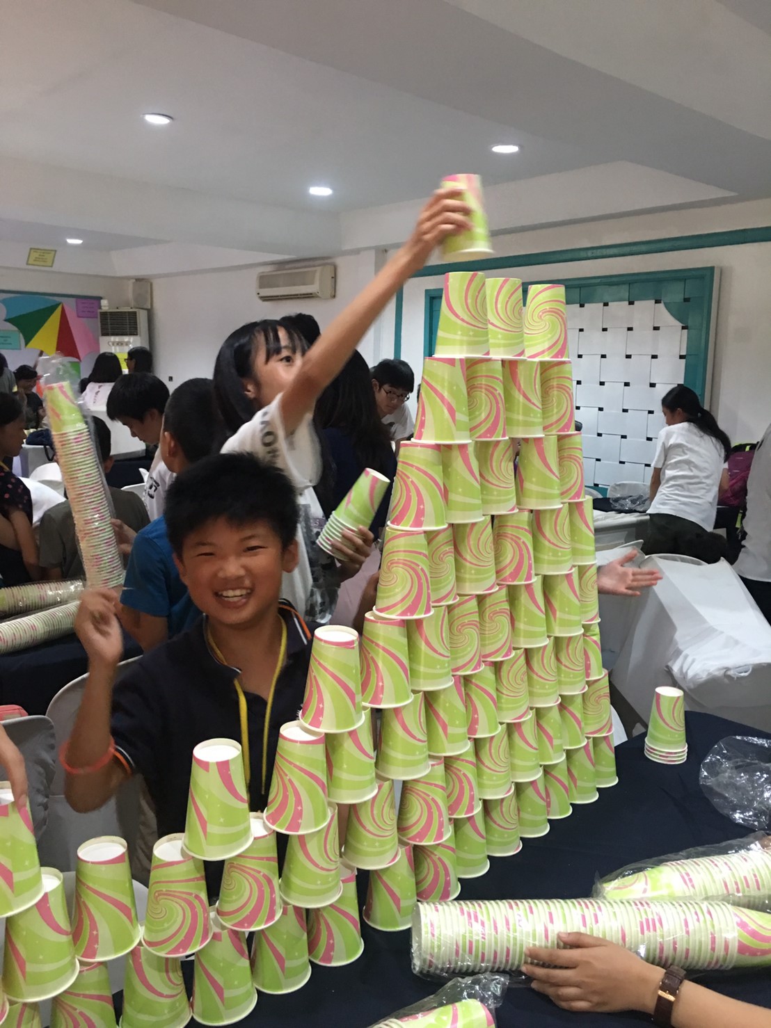 同じ大きさの紙コップを使って、どこまで高いタワーができるか、