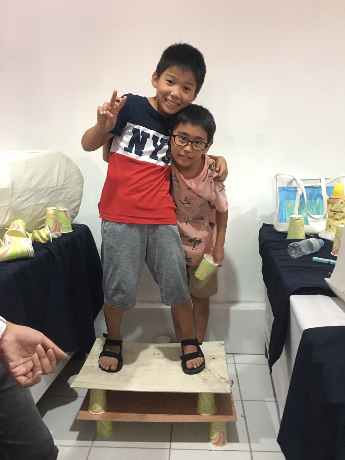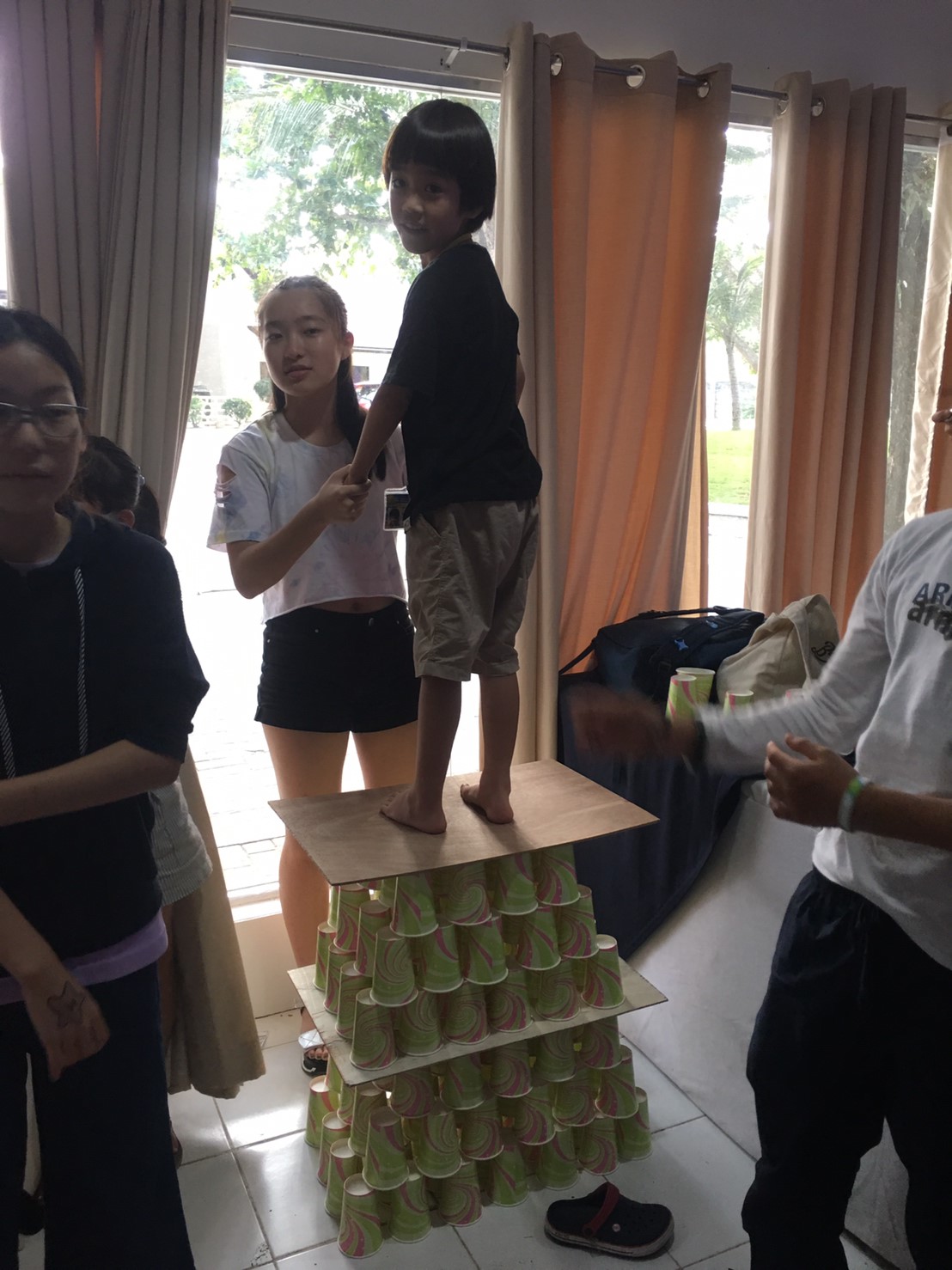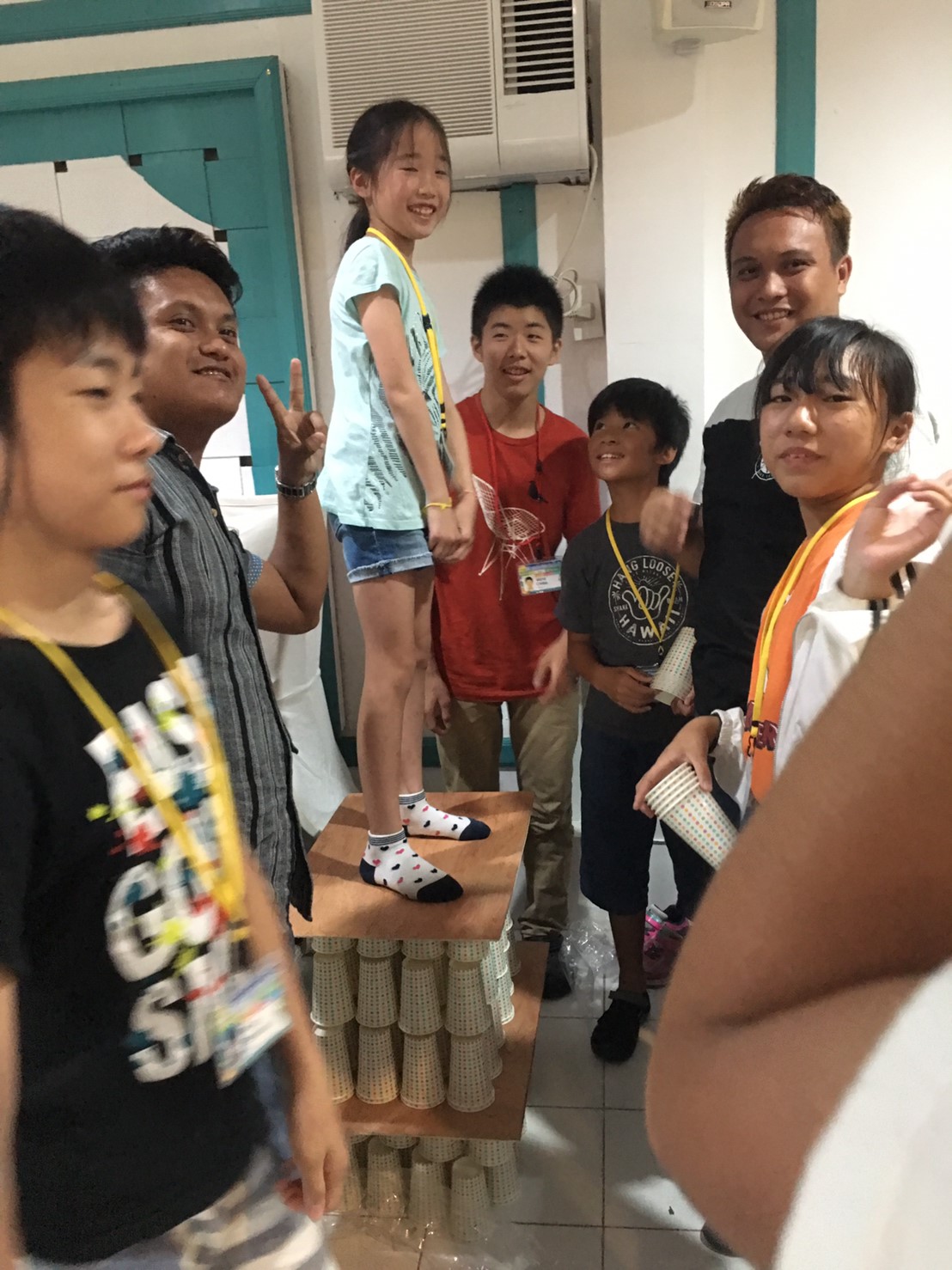 でも、紙コップを沢山使ってタワーを作り、上に乗ってみると・・・潰れません☆彡