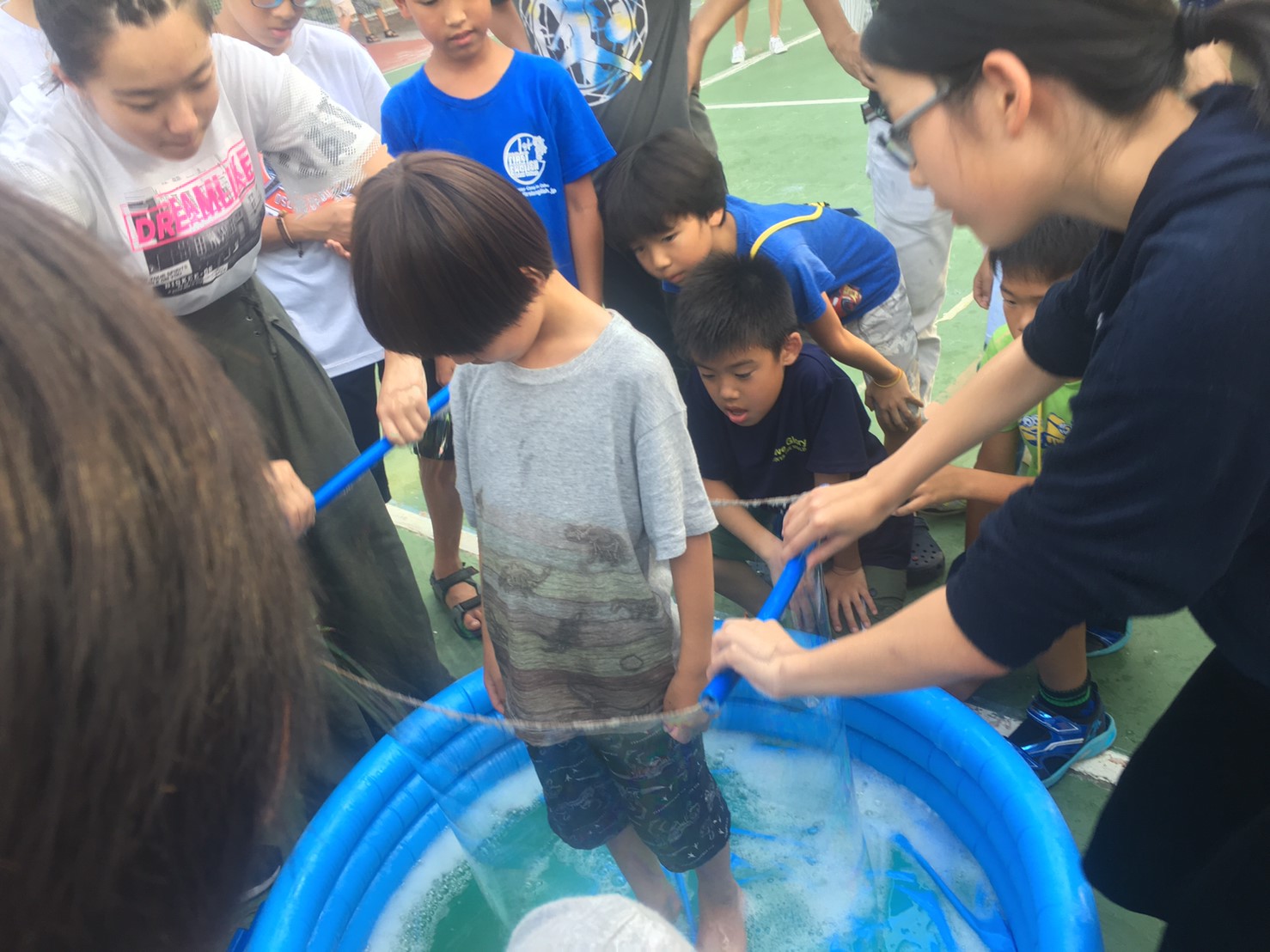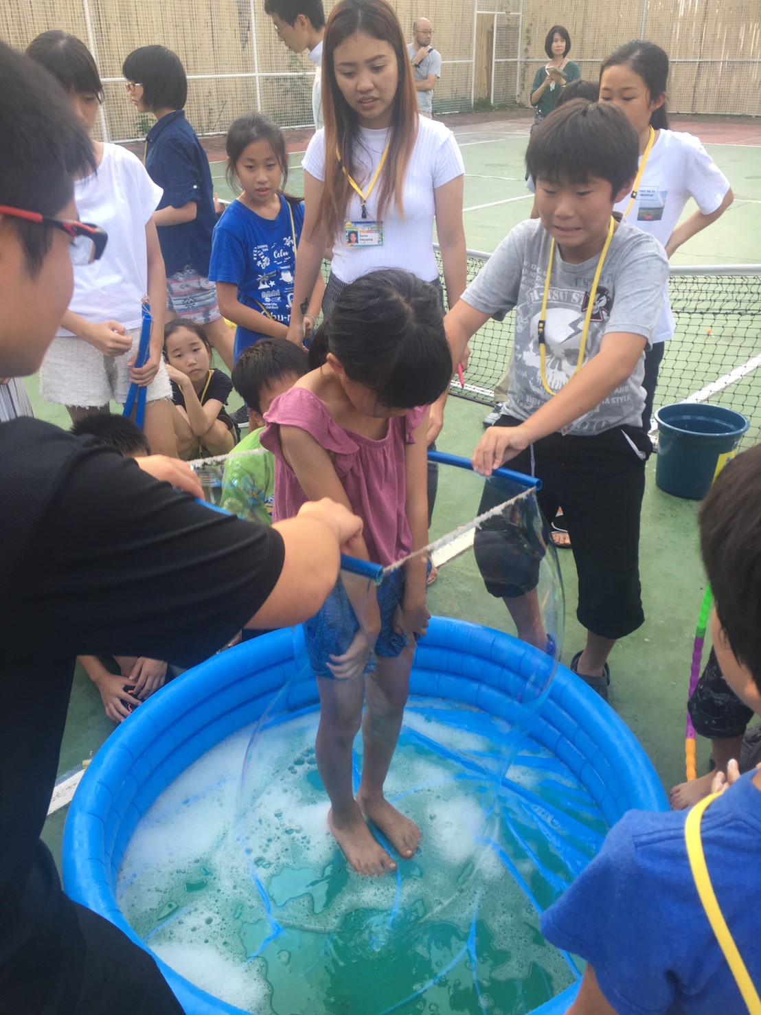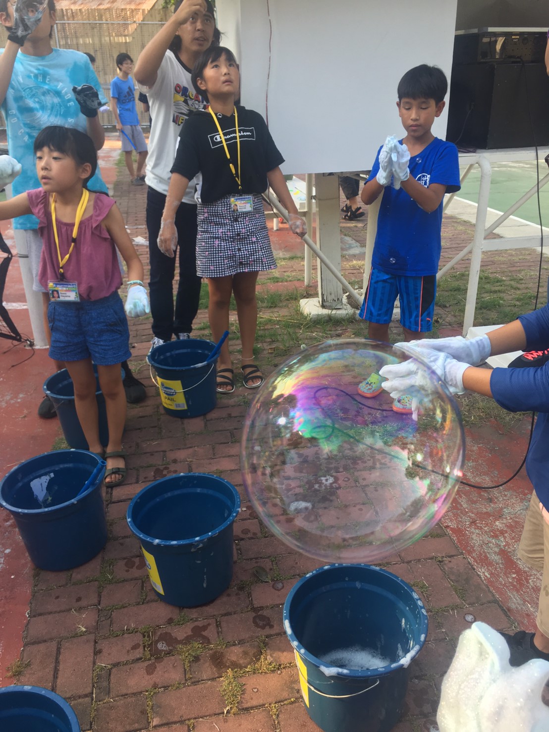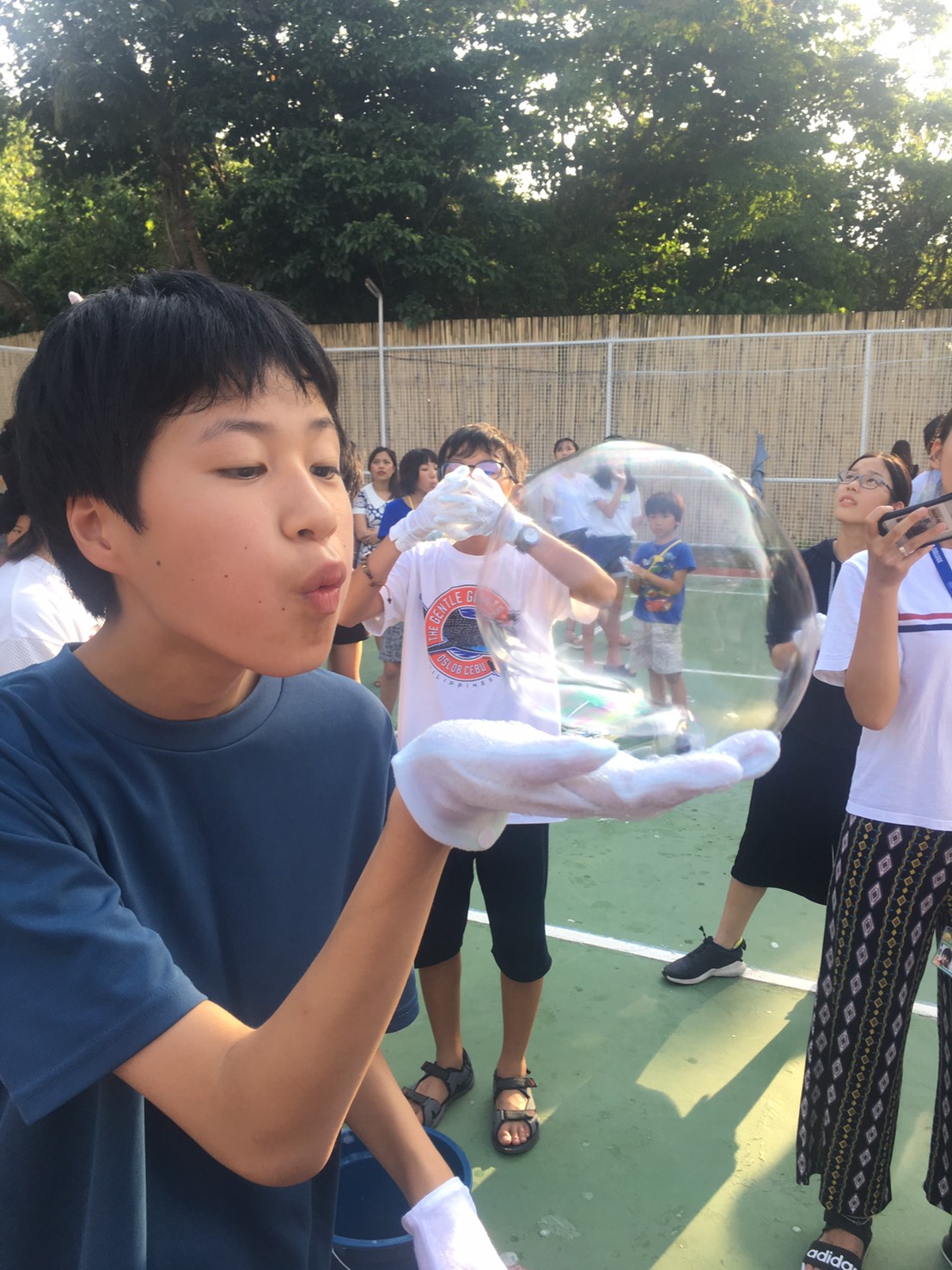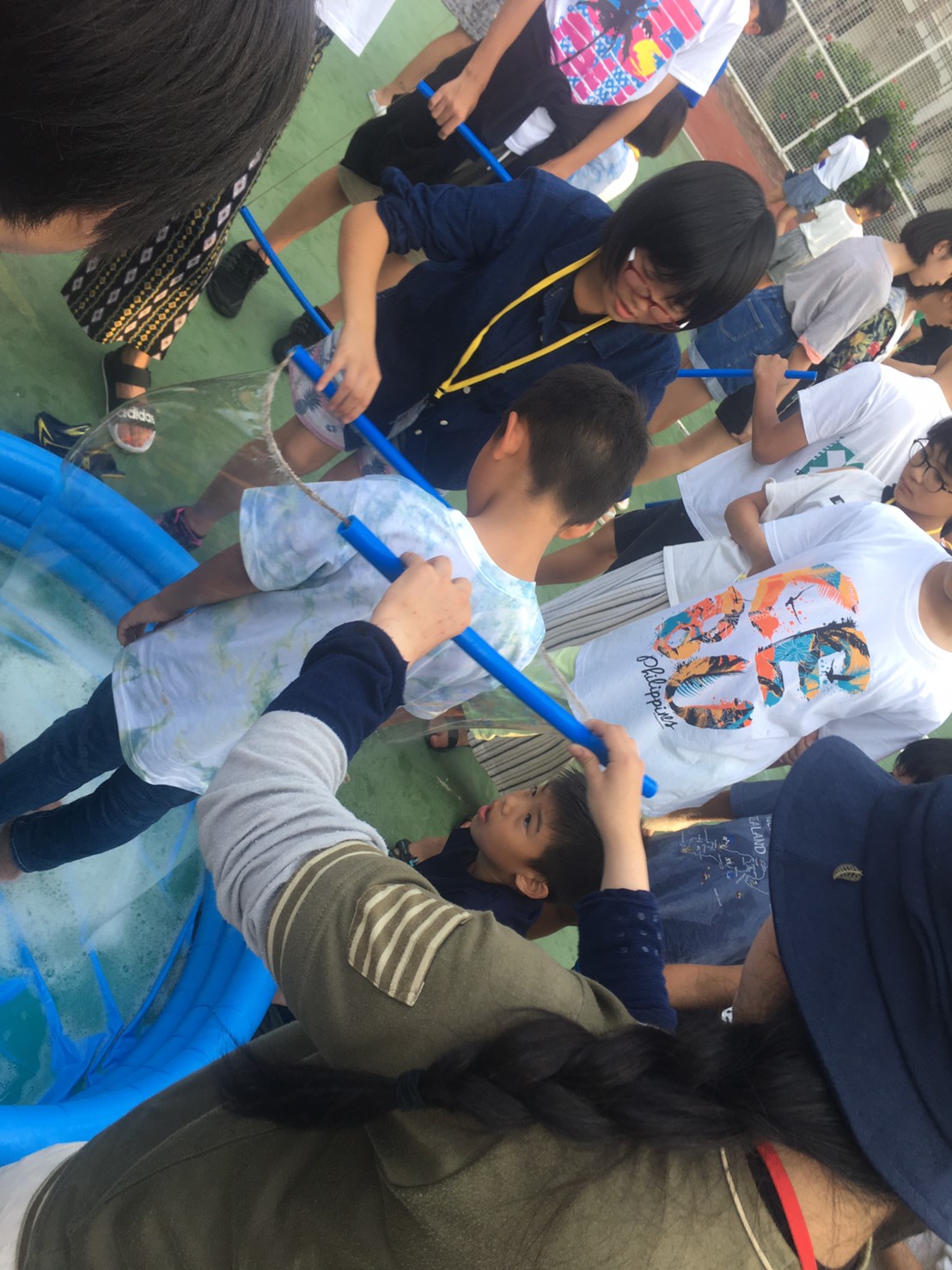 シャボン液を作る事から始まり、最後には体を包み込むサイズのシャボン玉作りにも挑戦しましたよ!!!