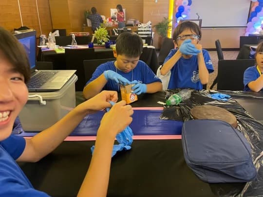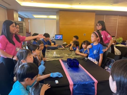 英語サイエンス実験クラスでは、みんなで楽しめる簡単な実験を通じて様々な知識と英単語を覚えていきます。