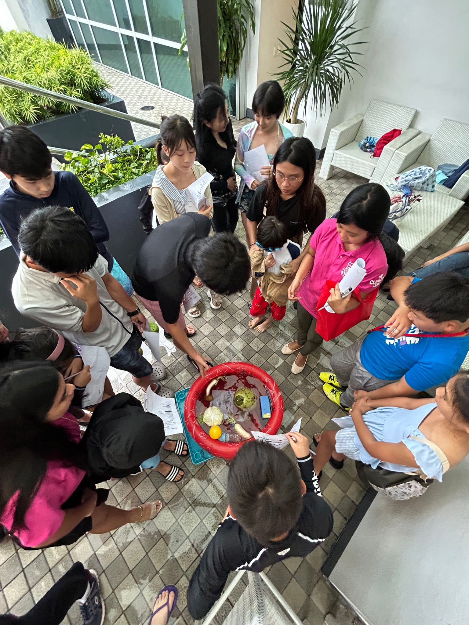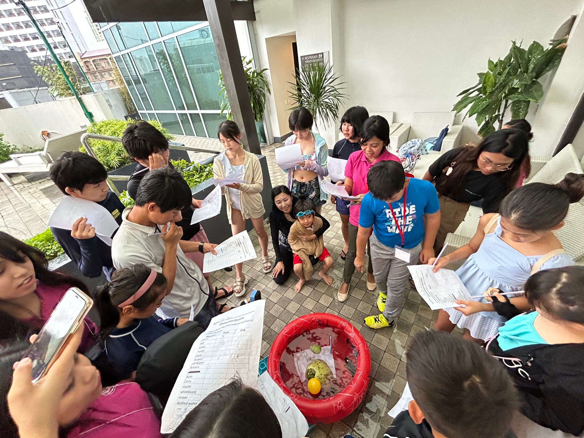 英語漬けジュニアキャンプに参加の子どもたちが、結果を予想してから実験スタート!
