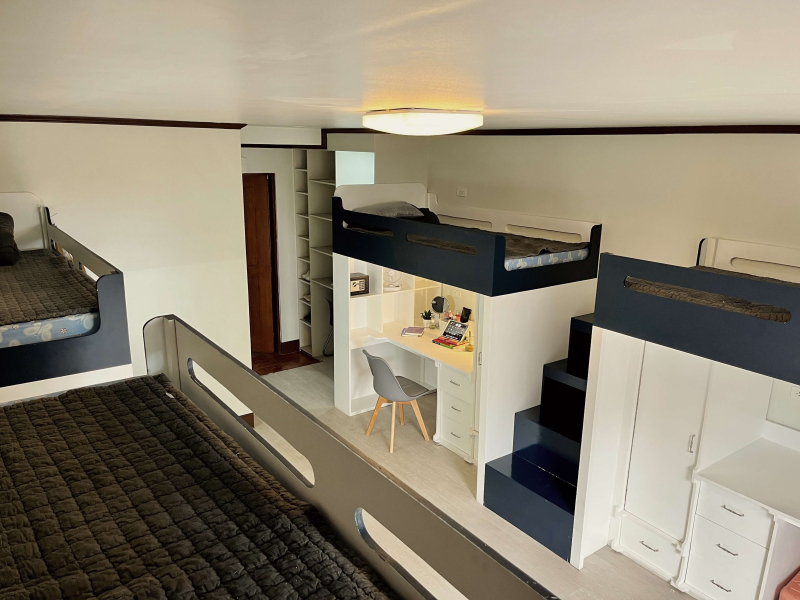2段ベッドタイプの作りで、下段には、勉強机と椅子、クローゼット、収納棚などがあり、勉強・整理整頓がしやすい環境。上段がベッドスペースとなっており、階段で上がるタイプなので安定感もあります。