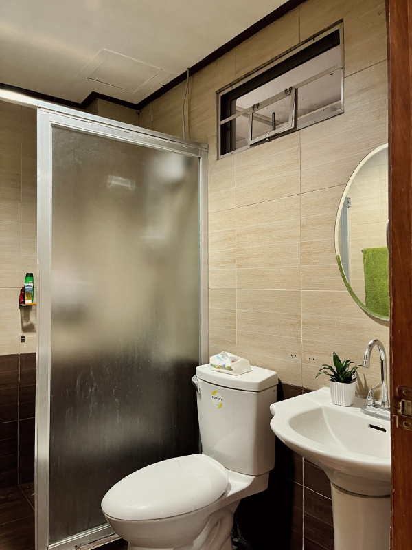 シャワールームとトイレはセパレートタイプで、シャワー室には扉付き。水跳ねを防ぎ、清潔に保たれています。入口付近には、靴収納・冷蔵庫・ミニ洗面台が設置されており、朝の支度もスムーズ。