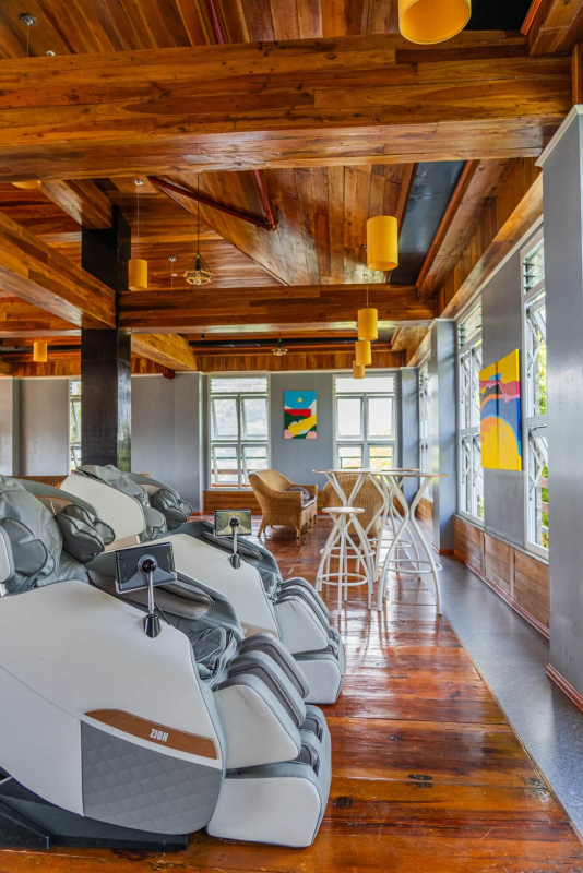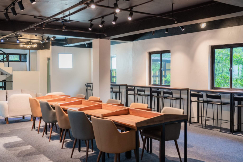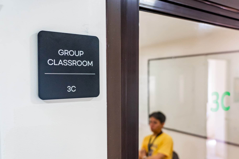 1〜4階は学生寮、5階にはカフェテリアを備えた本校のキャンパスは、まるでリゾートホテルのような設備と快適さが魅力。全室にフリーWi-Fiが完備され、NetflixやYouTubeの視聴もスムーズ。Zoomを使ったオンライン通話などは、開放的なカフェテリアでの利用が快適です。