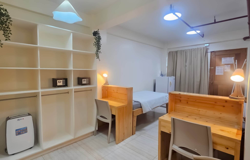 とにかく広くて快適!大きなベッド+すぐ隣に勉強机、ソファ&ミニテーブル付き。バスルームはユニットタイプ(トイレ・シャワー一体型)大きな鏡、冷蔵庫、ケトル、ドライヤーなど家電完備。特に長期滞在の方におすすめ!
