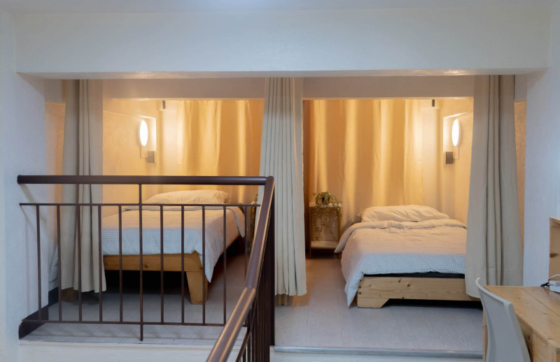 1階:リビング、2階:寝室の2層構造。ベッドが2つずつ、仕切り+カーテン付きで半個室のように使えてプライベード空間も保たれます。