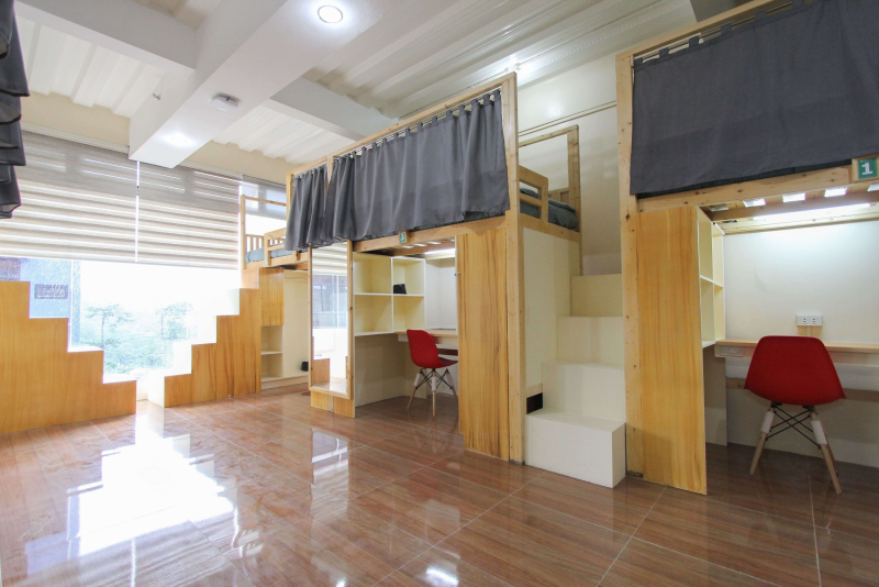 2段ベッドを1人1台使用。各ベッドにはカーテンと個別ライトが付き、簡易ながら自分の空間が確保できます。机がベッド下にある構造で、全体照明が消えた後も学習可能。